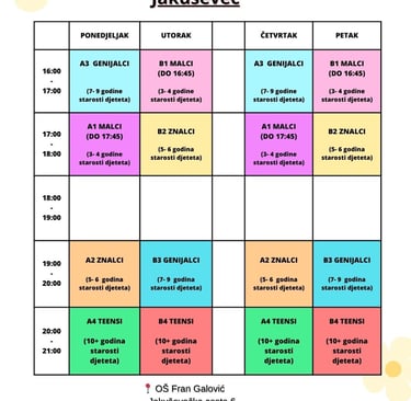 Program je namijenjen djeci osnovnoškolske dobi, s ciljem učenja složenijih motoričkih gibanja i osnovnih gimnastičkih elemenata na tlu, pritkama, gredi i preskoku. Aktivnosti potiču pravilan rast i razvoj te unapređuju koordinaciju, fleksibilnost i ravnotežu, uz naglasak na socijalizaciji i zabavi.