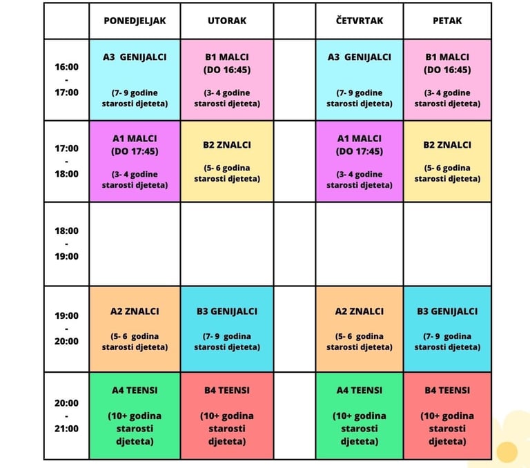 Cilj programa je zadovoljiti djetetovu potrebu za kretanjem te razviti osnovne motoričke i svakodnevne vještine. Kroz poligone i igru potiče se razvoj snage, koordinacije i fleksibilnosti, uz jačanje socijalnih vještina kao pripreme za školu.